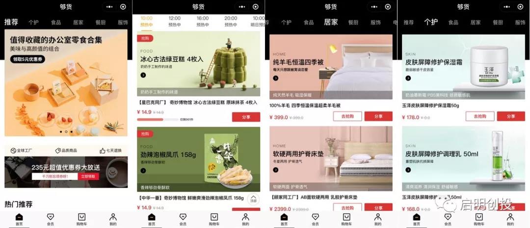 夠貨團(tuán)隊(duì)關(guān)于市場(chǎng)機(jī)會(huì)的觀點(diǎn)是,更具消費(fèi)力的女性及三四五線群體的生活消費(fèi)需求其實(shí)并沒有被這種模式覆蓋到,因此夠貨想從定位上做差異化,目前的品類也主打美妝、家居、食品等。