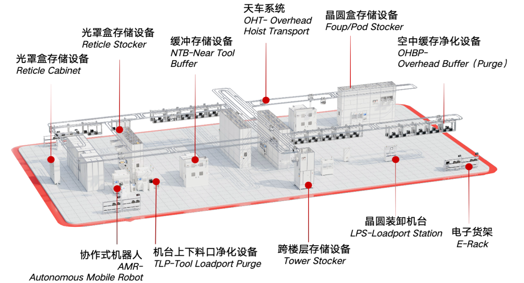 在對潔凈度、效率、安全要求極為苛刻的晶圓廠內(nèi),天車系統(tǒng)承擔(dān)著極為重要且復(fù)雜的整廠搬運任務(wù)。整套AMHS系統(tǒng)由多款軟件和硬件組成。軟件包括物料控制系統(tǒng)、天車調(diào)度軟件等;硬件包括天車、移動機器人、傳送線等搬運設(shè)備和潔凈立庫、空中緩存位、工作站等存儲設(shè)備以及樓層間的傳送存儲設(shè)備等。
