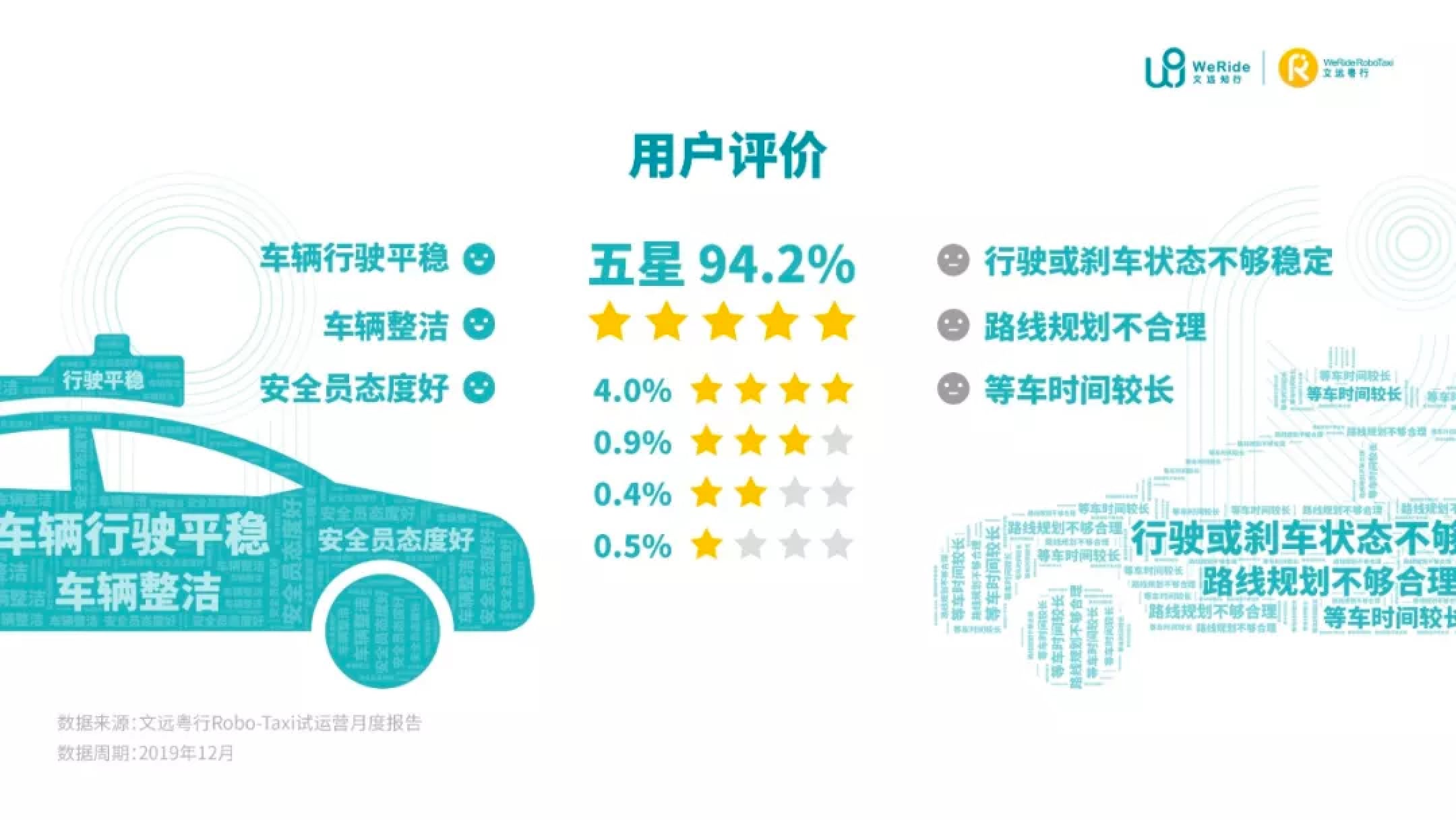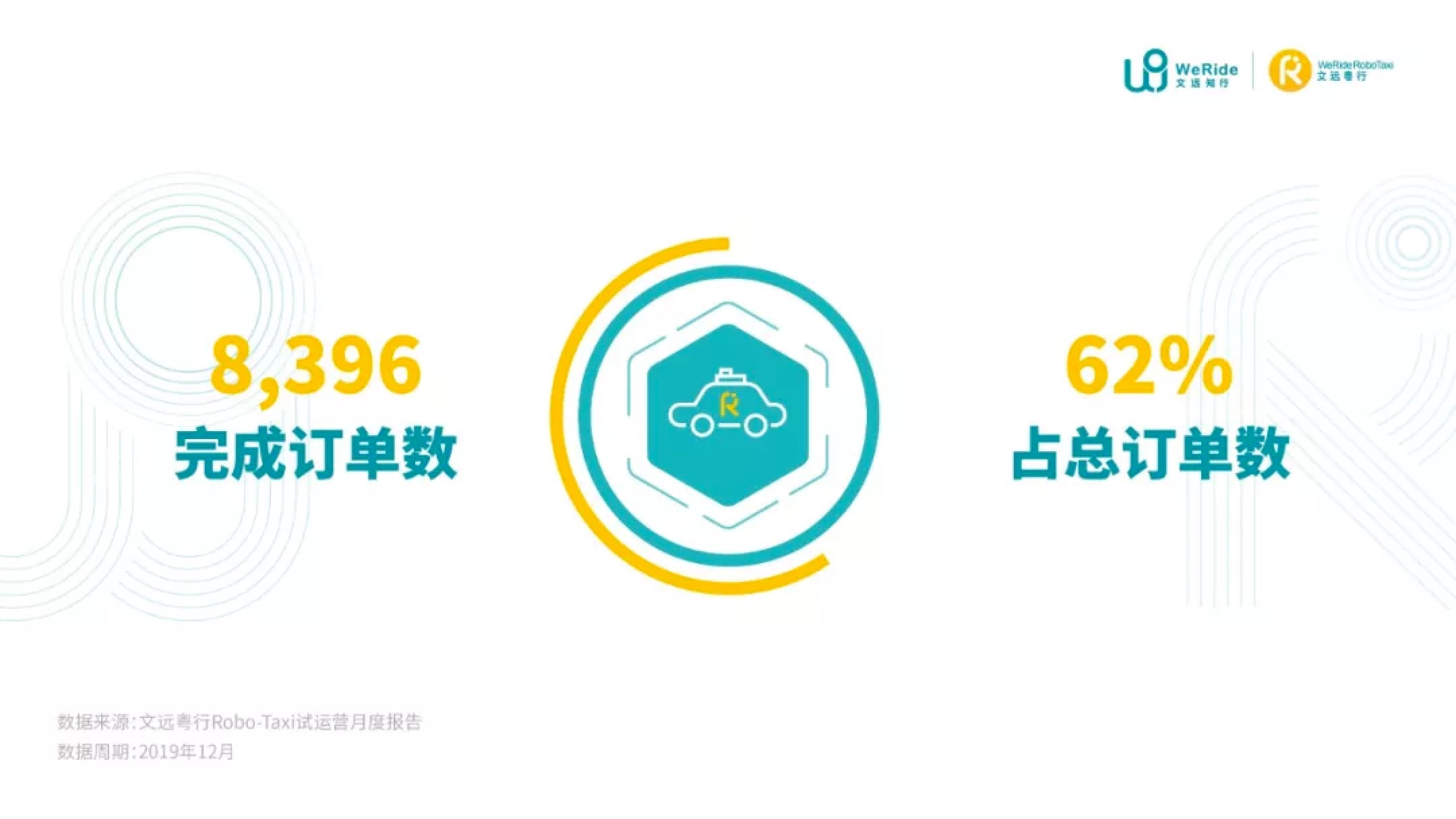 文遠粵行試運營首月,即2019年12月01日至31日,共完成8396個出行訂單,零安全事故,日均出行服務(wù)270.8次,單天最多訂單達到438單,服務(wù)訂單總里程達41140公里,共服務(wù)4683名用戶。