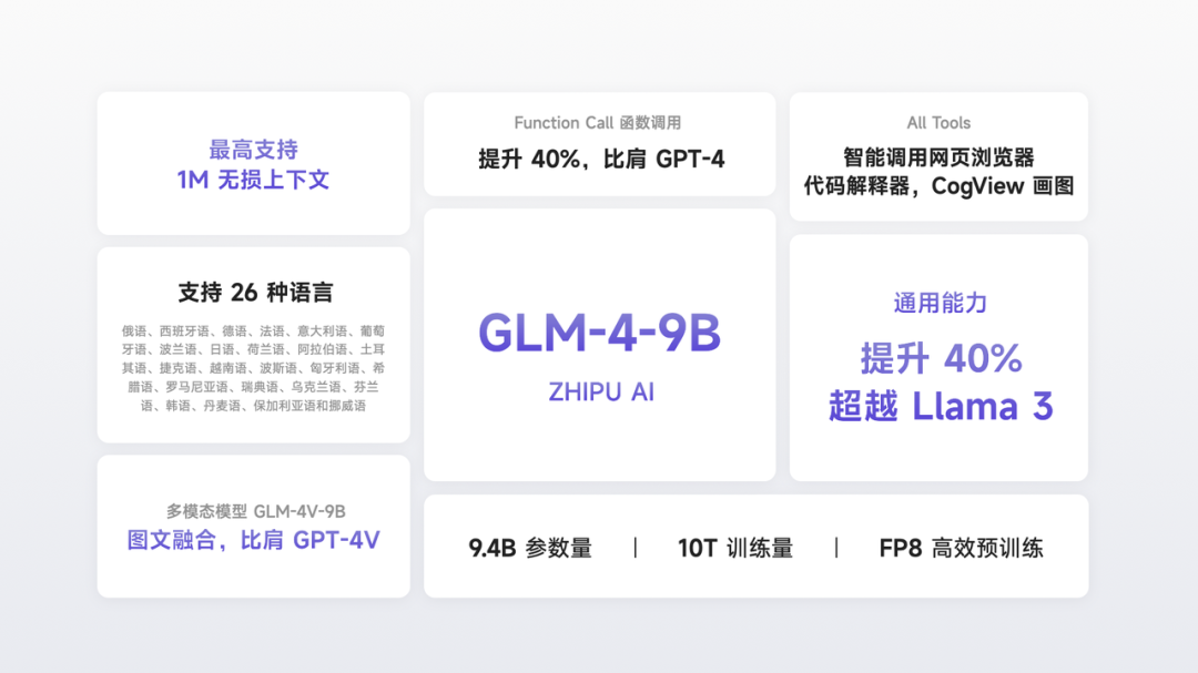 在預(yù)訓(xùn)練方面,GLM-4-9B使用了超過10T高質(zhì)量多語言數(shù)據(jù),通用能力相比上一代模型提升40%,甚至超過了Llama-3-8B。模型一共支持26種語言,并且最高支持1M(兩百萬字)的長文本。GLM-4-9B的函數(shù)調(diào)用能力提升了40%,性能比肩GPT-4,并且全面支持All Tools調(diào)用能力。基于文本基座,智譜AI還擴(kuò)展了多模態(tài)模型GLM-4V-9B,能夠很好地融合文本和視覺模態(tài),其性能比肩GPT-4V。