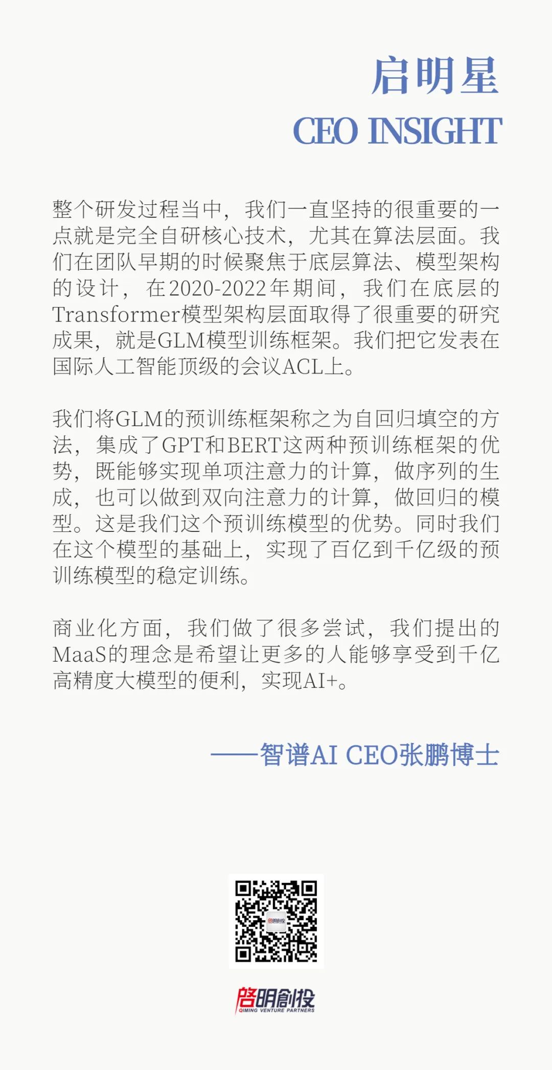 整個研發(fā)過程當中,我們一直堅持的很重要的一點就是完全自研核心技術,尤其在算法層面。我們在團隊早期的時候聚焦于底層算法、模型架構的設計,在2020-2022年期間,我們在底層的Transformer模型架構層面取得了很重要的研究成果,就是GLM模型訓練框架。我們把它發(fā)表在國際人工智能頂級的會議ACL上。