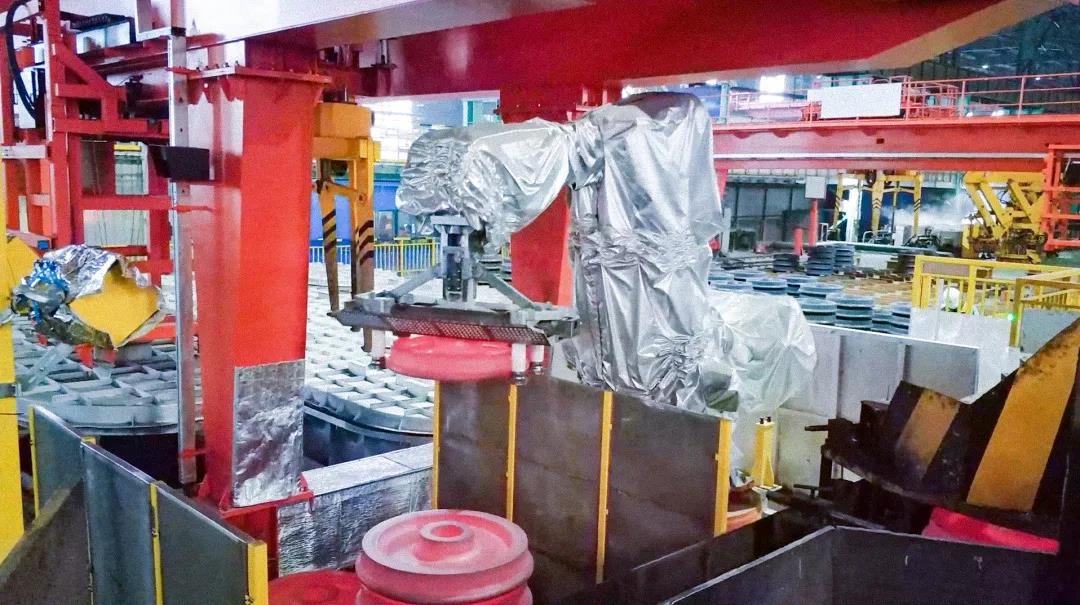 于是我們?cè)诿房路?wù)的一家鋼鐵廠車間看到這樣的場(chǎng)景:一個(gè)全身包裹嚴(yán)實(shí)的機(jī)器手臂將自己的觸手伸向燒紅的剛成型的上百公斤重的火車輪,進(jìn)行自動(dòng)識(shí)別與抓取,此時(shí)的工件溫度超過(guò)500攝氏度。而在過(guò)去,這一項(xiàng)工作需要工人冒著酷熱在車間內(nèi)進(jìn)行機(jī)械操作實(shí)現(xiàn),即便進(jìn)行足夠的降溫通風(fēng),也很少有工人真正愿意做這項(xiàng)工作。