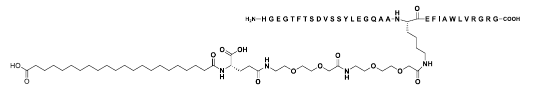 GZR18注射液是一種基于脂肪酸?;O(shè)計(jì)的GLP-1RA,具有每周或每?jī)芍芙o藥一次的潛力,其與人源GLP-1分子的同源性高達(dá)94%。GZR18注射液在人源GLP-1肽鏈基礎(chǔ)上進(jìn)行了3處氨基酸位點(diǎn)修飾,從而將脂肪酸?;x擇性限制到第26位賴氨酸上。GZR18注射液選用22碳脂肪二酸側(cè)鏈,與白蛋白強(qiáng)力且可逆結(jié)合,從而延長(zhǎng)作用時(shí)間。多肽主鏈和脂肪酸側(cè)鏈由2個(gè)OEG(3,8-二氧代氨基辛酸)間隔子和1個(gè)L-γ谷氨酸連接子連接,使GZR18注射液的肽鏈在體內(nèi)與白蛋白的物理距離更近,利于空間折疊,降低藥物降解,延長(zhǎng)半衰期。GZR18注射液獨(dú)特的分子設(shè)計(jì)優(yōu)化其與GLP-1受體的親和力,減少GLP-1受體介導(dǎo)的胃腸道反應(yīng),提高藥物耐受性。給予適當(dāng)?shù)牡味ńo藥方案,GZR18注射液有望實(shí)現(xiàn)更高的治療劑量,以期實(shí)現(xiàn)更好的治療效果。