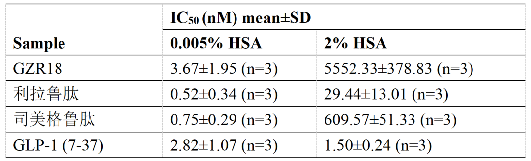 臨床前研究表明,GZR18注射液的生物活性與GLP-1受體的親和力較其他GLP-1RA更低。在人血清白蛋白(HSA)存在或不存在的條件下,GZR18注射液與GLP-1受體的親和力均弱于利拉魯肽和司美格魯肽。