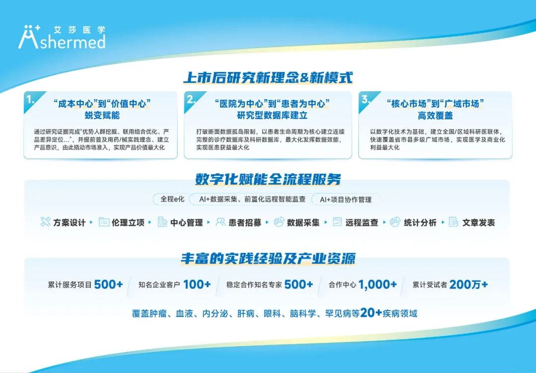 艾莎醫(yī)學(xué)作為一家致力于為國內(nèi)外創(chuàng)新藥械企業(yè)提供上市后臨床研究的一站式專業(yè)服務(wù)公司,正通過互聯(lián)網(wǎng)+數(shù)智化技術(shù)重塑臨床研究運(yùn)營管理流程,推廣創(chuàng)新運(yùn)營管理模式,以更高效地賦能和加速推動中國創(chuàng)新藥械產(chǎn)品的研發(fā)過程。經(jīng)過10年的發(fā)展,艾莎醫(yī)學(xué)已經(jīng)成為真實(shí)世界研究領(lǐng)域的佼佼者。