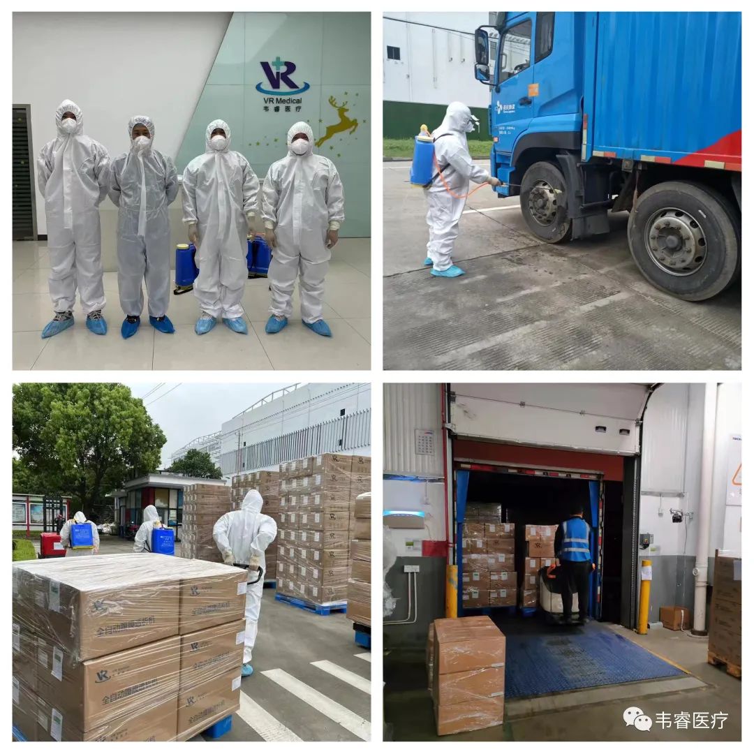 為了實現(xiàn)防疫要求,韋睿醫(yī)療決定在一個小時內(nèi)完成轉(zhuǎn)倉、消殺和裝載等全部工作。為確保整個運輸過程在安全、有序、高效中進行,韋睿醫(yī)療各部門爭分奪秒,連夜制定“車輛入周裝貨的閉環(huán)管理方案”,既有條不紊地做好產(chǎn)品質(zhì)控和出貨安排,又嚴格做好個人防護和環(huán)境消殺等防疫準備。