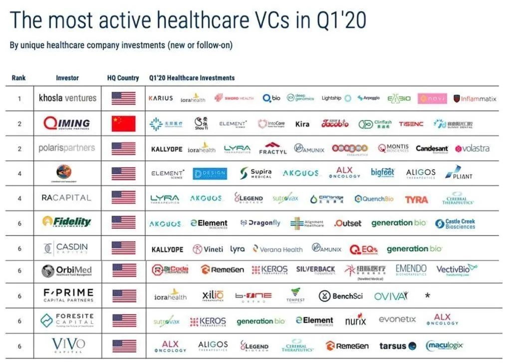CB Insights 《2020年一季度醫(yī)療健康領(lǐng)域最活躍風(fēng)險(xiǎn)投資機(jī)構(gòu)》榜單