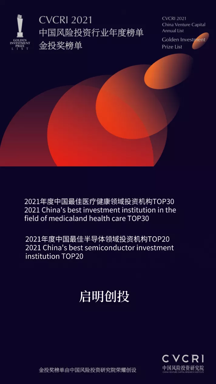 在產(chǎn)業(yè)榜單中,啟明創(chuàng)投獲評2021年度中國最佳醫(yī)療健康領(lǐng)域投資機構(gòu)TOP30及中國最佳半導(dǎo)體領(lǐng)域投資機構(gòu)TOP20兩項大獎。