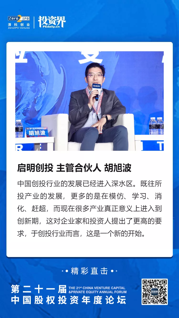 啟明創(chuàng)投主管合伙人胡旭波在第21屆中國(guó)股權(quán)投資年度論壇上表示,中國(guó)創(chuàng)投行業(yè)的發(fā)展已經(jīng)進(jìn)入深水區(qū)。既往所投產(chǎn)業(yè)的發(fā)展,更多的是在模仿、學(xué)習(xí)、消化、趕超,而現(xiàn)在很多產(chǎn)業(yè)真正意義上進(jìn)入到創(chuàng)新期,這對(duì)企業(yè)家和投資人提出了更高的要求,于創(chuàng)投行業(yè)而言,這是一個(gè)新的開始。