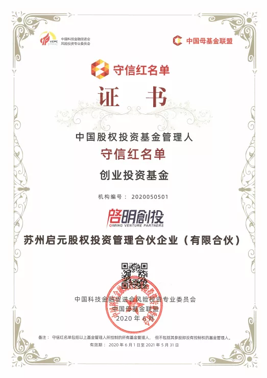 由中國(guó)科技金融促進(jìn)會(huì)風(fēng)險(xiǎn)投資專業(yè)委員會(huì)和中國(guó)母基金聯(lián)盟主辦,母基金研究中心協(xié)辦的“2020中國(guó)母基金峰會(huì)”日前在深圳舉辦,峰會(huì)重磅發(fā)布2020中國(guó)母基金峰會(huì)年中通報(bào)表?yè)P(yáng)名單。啟明創(chuàng)投榮膺“2020 VC基金最佳回報(bào)TOP50”,同時(shí)獲頒第二批中國(guó)股權(quán)投資基金管理人守信紅名單證書(shū)。