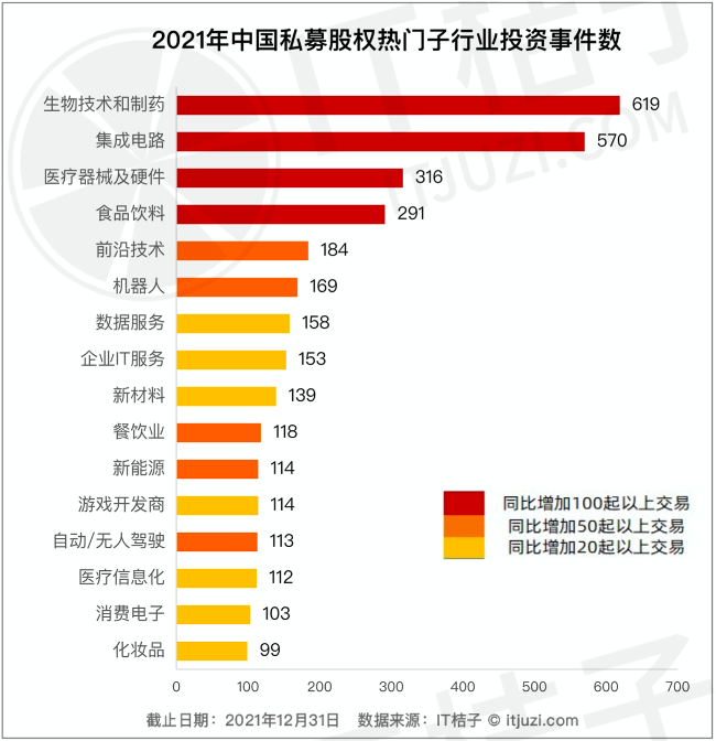 從投資角度觀察,2021年中國(guó)新經(jīng)濟(jì)投資熱門領(lǐng)域主要涉及醫(yī)療、先進(jìn)制造、消費(fèi)、企業(yè)服務(wù)等幾個(gè)大行業(yè),細(xì)分子行業(yè)包括生物技術(shù)和制藥、集成電路、醫(yī)療器械及硬件、食品飲料、前沿技術(shù)、機(jī)器人、數(shù)據(jù)服務(wù)、企業(yè)IT服務(wù)等。