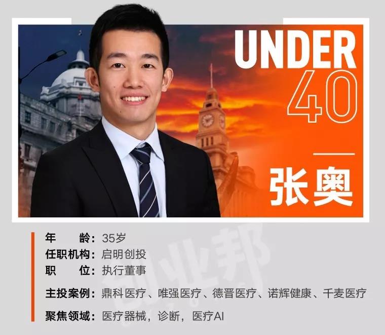 創(chuàng)業(yè)邦日前發(fā)布2019年度40位40歲以下投資人榜單,啟明創(chuàng)投執(zhí)行董事張奧上榜,成為榜單中四位主投醫(yī)療健康領域的投資人之一。