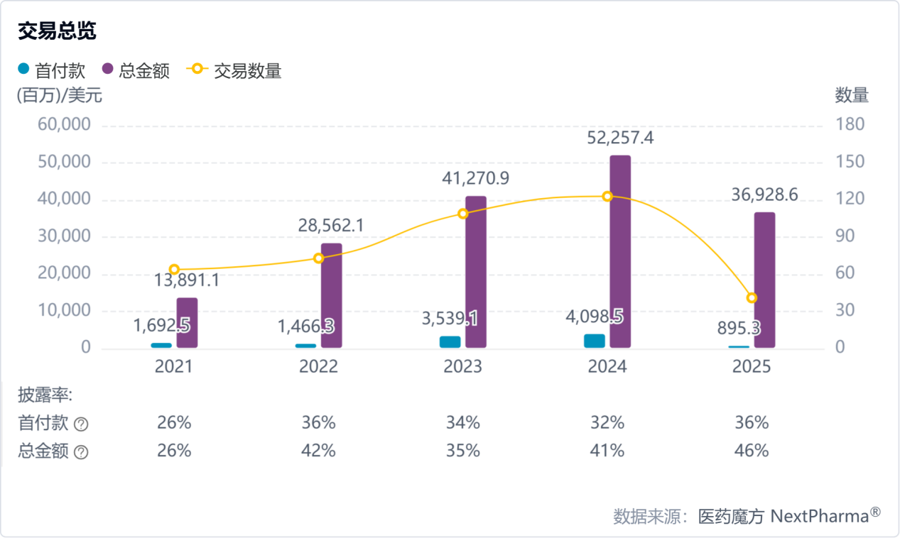 2021年至2025年第一季度中國創(chuàng)新藥license-out(對外授權(quán))交易情況
