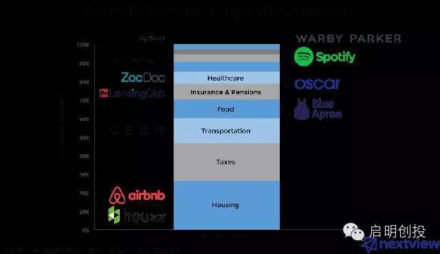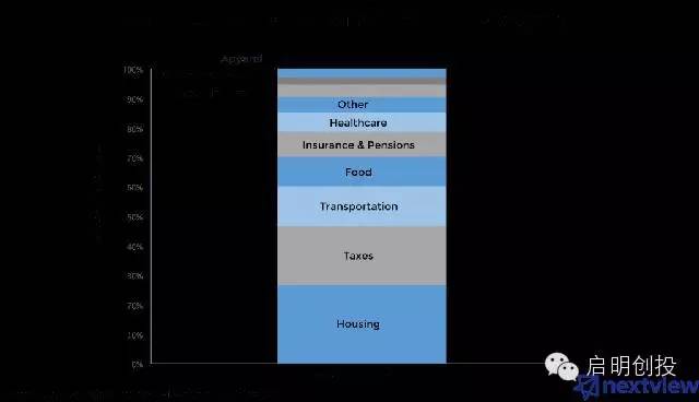 遵循這個邏輯我們就不難發(fā)現(xiàn),Uber、Airbnb這兩個全球最具價值的創(chuàng)企都屬于消費大類:行和住。當(dāng)然,它們只是眾多公司的兩個代表而已。 下圖是消費者支出最多的幾大類: