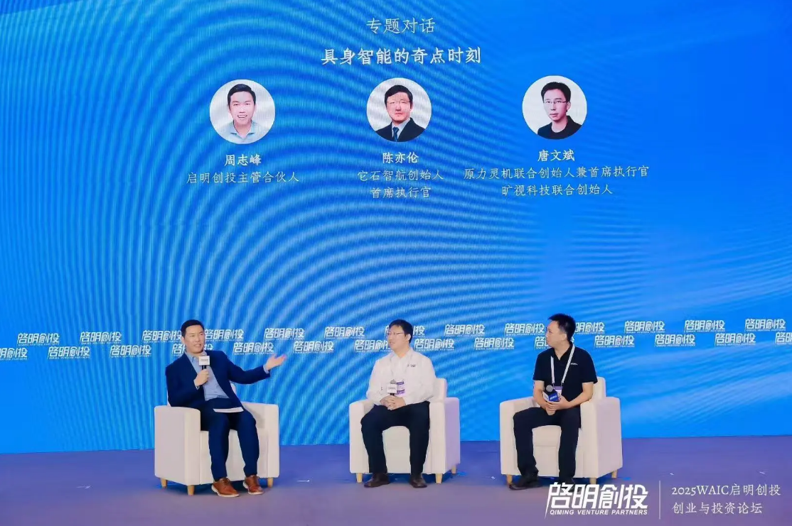 在對(duì)話環(huán)節(jié)中,啟明創(chuàng)投主管合伙人周志峰擔(dān)任主持人,與它石智航創(chuàng)始人兼首席執(zhí)行官陳亦倫,以及原力靈機(jī)聯(lián)合創(chuàng)始人兼首席執(zhí)行官、曠視科技聯(lián)合創(chuàng)始人唐文斌圍繞“具身智能的奇點(diǎn)時(shí)刻”展開(kāi)討論。