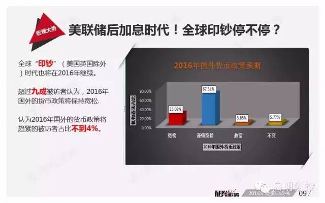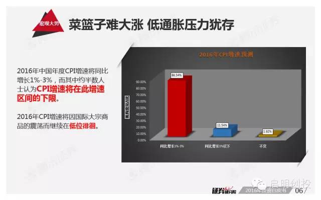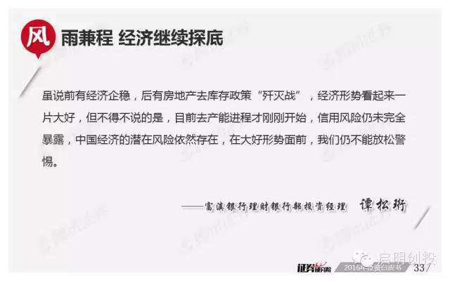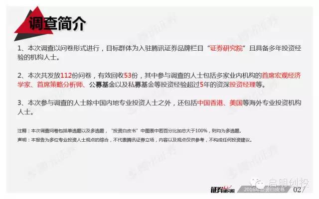 新年第二周面世的《2016年投資白皮書(shū):繁華過(guò)后,風(fēng)雨前行》由騰訊證券獨(dú)家打造,該報(bào)告依托品牌欄目專家智庫(kù)平臺(tái)“證券研究院”,通過(guò)對(duì)近百位業(yè)內(nèi)頂級(jí)大佬的調(diào)查問(wèn)卷,對(duì)2016年宏觀經(jīng)濟(jì)形勢(shì)及資本市場(chǎng)運(yùn)行做出分析預(yù)測(cè)。