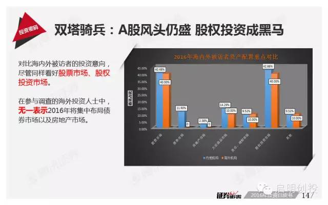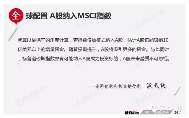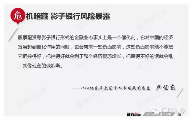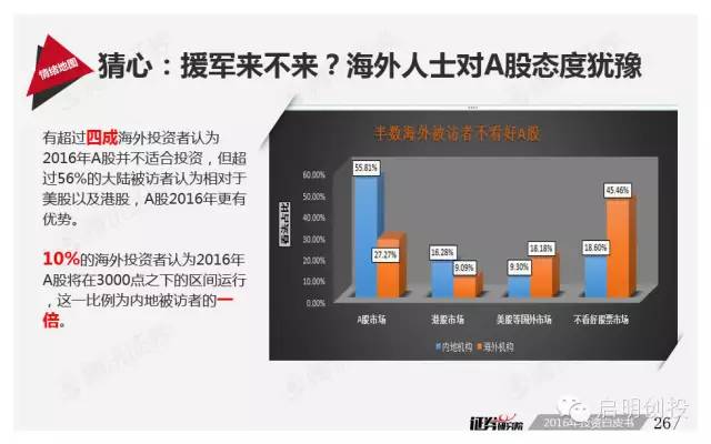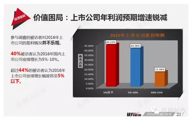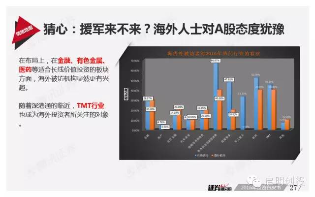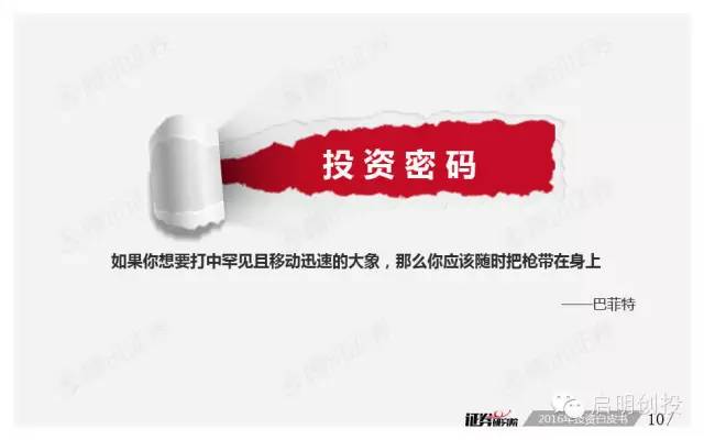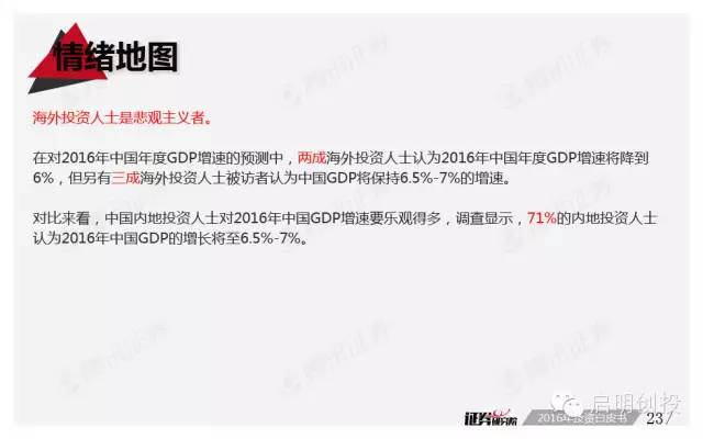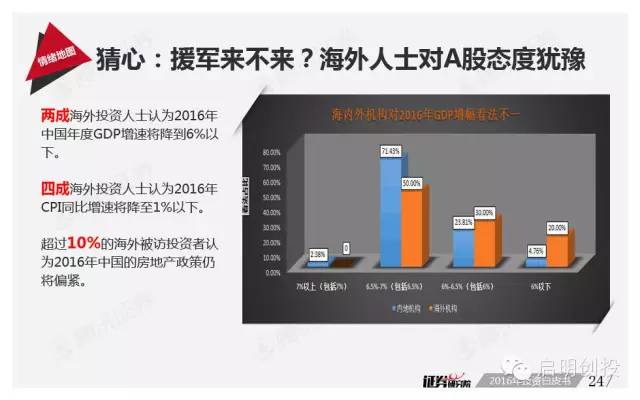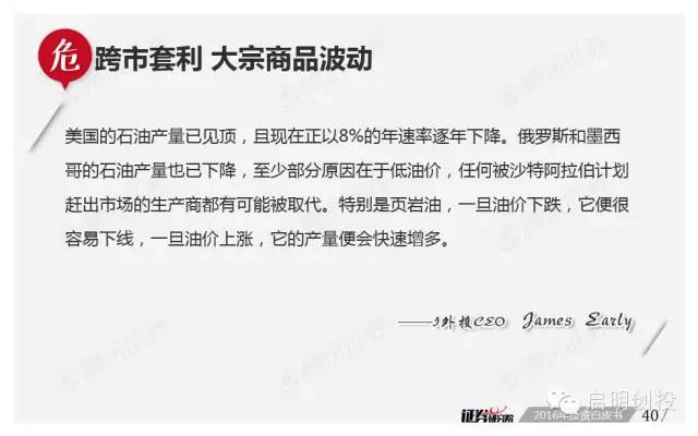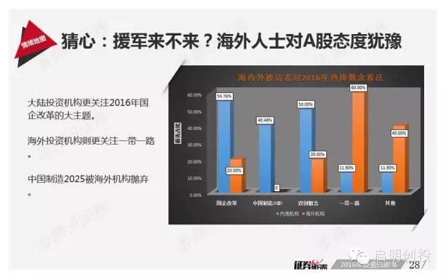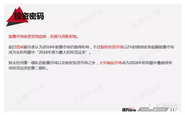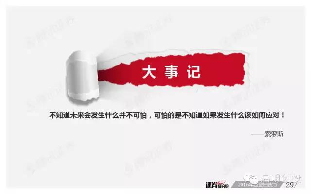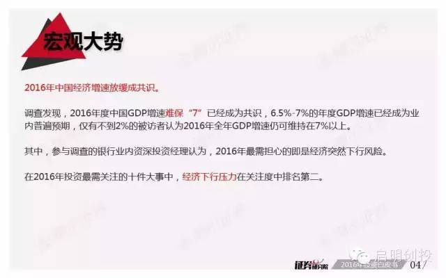 但“黑天鵝”不可不防,經(jīng)濟(jì)下滑風(fēng)險(xiǎn)成為被訪者眼中最值得關(guān)注的風(fēng)險(xiǎn)之一,去產(chǎn)能化以及調(diào)結(jié)構(gòu)并行,A股市場(chǎng)將如何適應(yīng),也是機(jī)構(gòu)普遍思考的問(wèn)題。 以下為《2016年投資白皮書(shū)》41頁(yè)純干貨,精彩內(nèi)容不容錯(cuò)過(guò)!