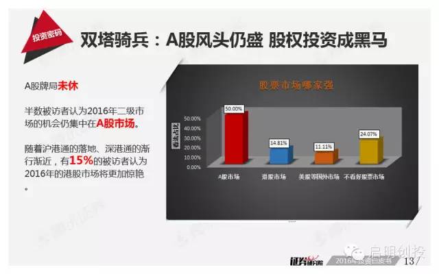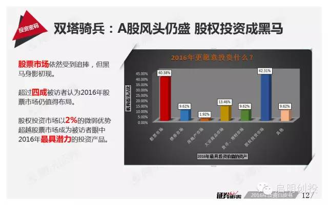 摘要:盡管投資者們依然期盼牛市,但白皮書(shū)調(diào)查顯示,2016年再次出現(xiàn)“瘋?!毙星榈目赡苄圆⒉淮?。在大類資產(chǎn)配置中,雖然仍有超過(guò)40%的被訪專家認(rèn)為2016年股市仍然是最好的投資品類,但是股權(quán)投資的“人氣指數(shù)”已經(jīng)逆襲,新三板等投資領(lǐng)域?qū)⒂瓉?lái)春天。