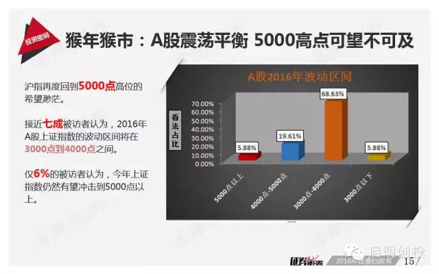 單就A股投資而言,2016年上證指數(shù)難有驚艷表現(xiàn)。接近七成被訪機(jī)構(gòu)認(rèn)為A股上證指數(shù)的波動(dòng)區(qū)間將在3000點(diǎn)到4000點(diǎn)之間,而聯(lián)訊證券副總裁曹衛(wèi)東認(rèn)為A股下限可能觸及2500點(diǎn)。