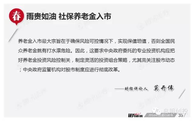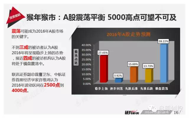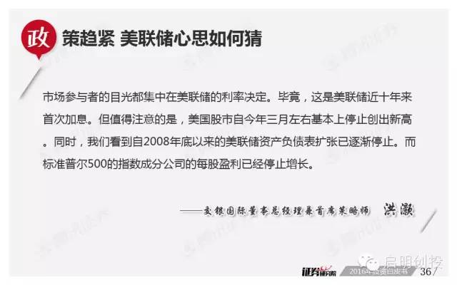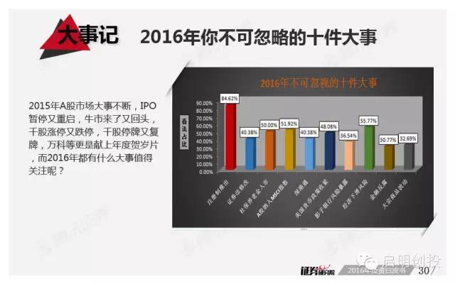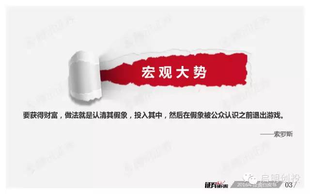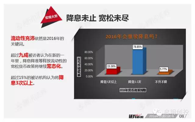 新年第二周面世的《2016年投資白皮書(shū)》由騰訊證券獨(dú)家打造,該報(bào)告依托品牌欄目專家智庫(kù)平臺(tái)“證券研究院”,通過(guò)對(duì)近百位業(yè)內(nèi)頂級(jí)大佬的調(diào)查問(wèn)卷,對(duì)2016年宏觀經(jīng)濟(jì)形勢(shì)及資本市場(chǎng)運(yùn)行做出分析預(yù)測(cè)。