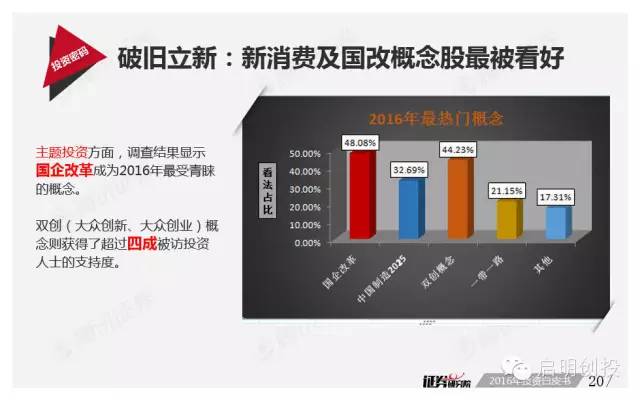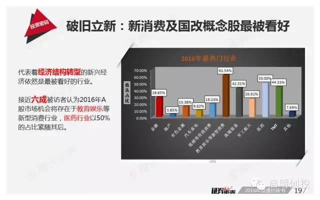 接近六成被訪機(jī)構(gòu)認(rèn)為2016年A股市場(chǎng)機(jī)會(huì)將出現(xiàn)在教育娛樂(lè)等新型消費(fèi)行業(yè),醫(yī)藥、TMT以及高端裝備行業(yè)則是最被看好的行業(yè)之一,而在概念布局上,國(guó)企改革和“雙創(chuàng)”概念也成為香餑餑。