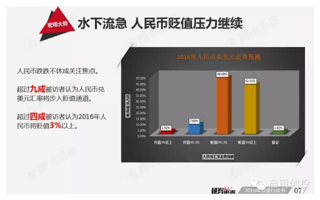 人民幣貶值的壓力也是2016年的投資擔(dān)憂所在,超過(guò)九成被訪機(jī)構(gòu)認(rèn)為人民幣兌美元匯率將步入貶值通道。