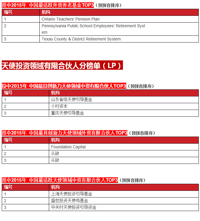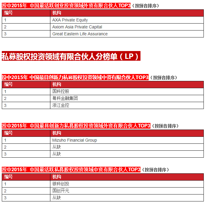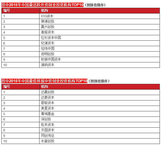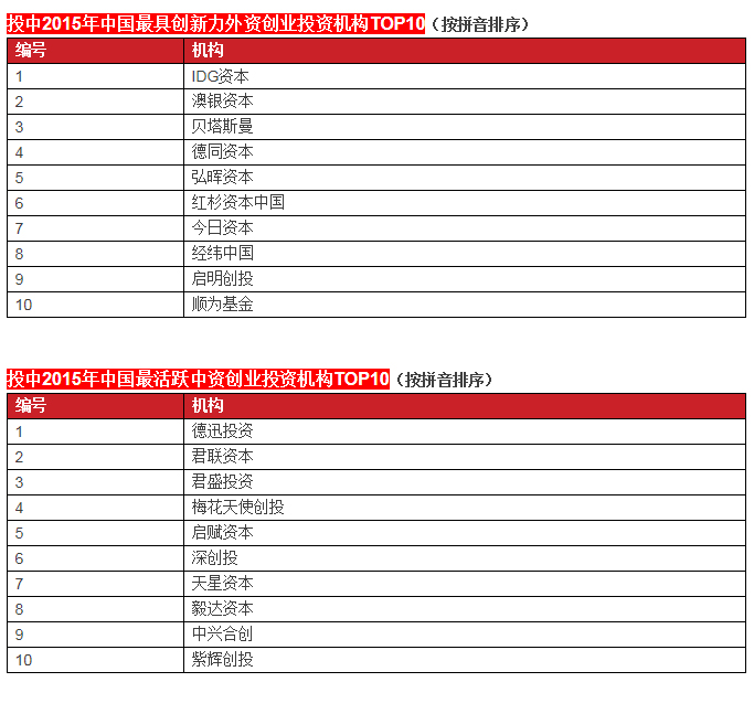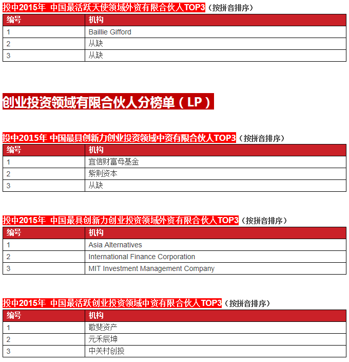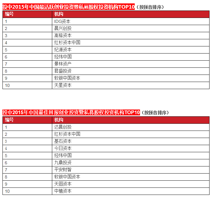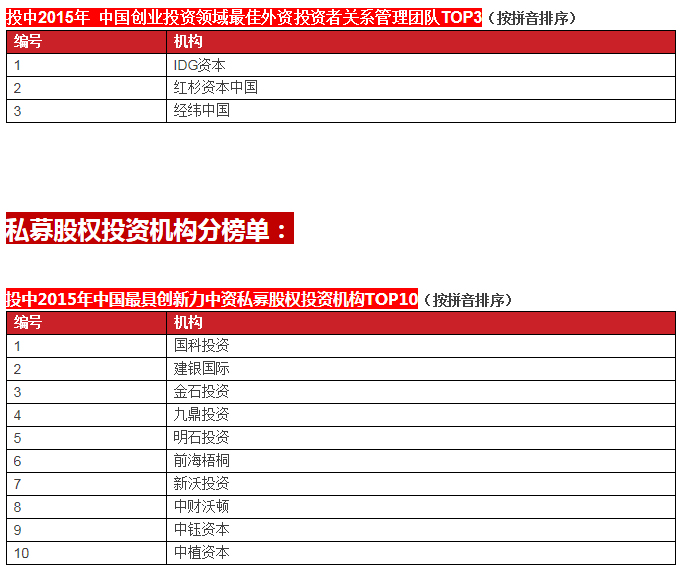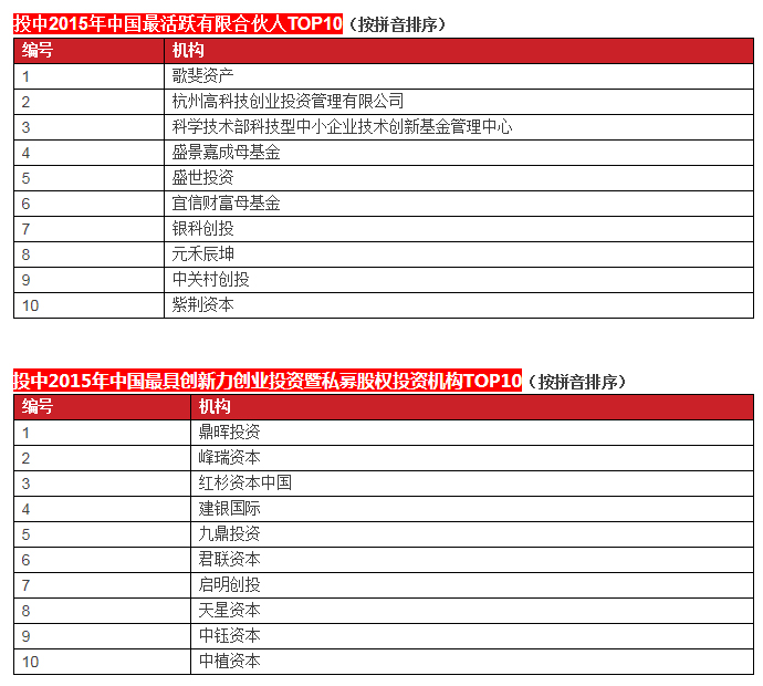 啟明創(chuàng)投榮膺投中2015年中國最具創(chuàng)新力創(chuàng)業(yè)投資暨私募股權(quán)投資機構(gòu)TOP10, 中國最具創(chuàng)新力外資創(chuàng)業(yè)投資機構(gòu)TOP10, 中國最活躍外資創(chuàng)業(yè)投資機構(gòu)TOP10和中國最佳回報外資創(chuàng)業(yè)投資機構(gòu)TOP10.啟明主管合伙人甘劍平先生榮膺投中2015年中國最受外資有限合伙人關(guān)注VC投資人(70s)TOP5。