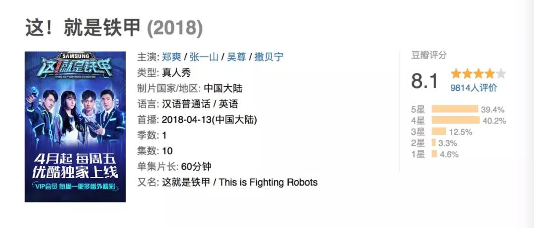 年初,創(chuàng)客星球就聯(lián)合浙江衛(wèi)視打造過《鐵甲雄心》,豆瓣評分8.2,同樣品質(zhì)上乘。兩相對比,《這就是鐵甲》引入“明星經(jīng)理人”元素,在娛樂化的包裝和年輕態(tài)的表達(dá)上,作出了更貼合網(wǎng)綜屬性的升級。