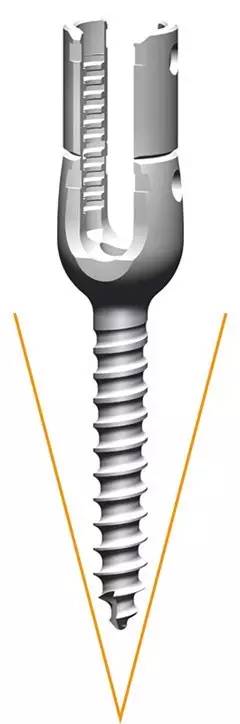 錐度釘體使螺釘更易于旋入,尤其長(zhǎng)節(jié)段手術(shù)時(shí)更能省時(shí)省力。同時(shí)錐度設(shè)計(jì)抗拔出力強(qiáng),根部加粗的設(shè)計(jì),更大程度避免了斷釘?shù)那闆r發(fā)生。