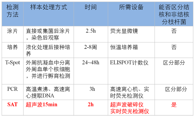 自2000年后核酸擴(kuò)增技術(shù)(NAAT)在美國(guó)成為T(mén)B診斷的一個(gè)常規(guī)診斷方法,2008年更新的美國(guó)CDC指南中指出對(duì)于每一個(gè)TB疑似患者至少有一個(gè)樣本應(yīng)當(dāng)使用NAAT法檢測(cè)。SAT是一種結(jié)核病NAAT檢測(cè)新技術(shù),不僅靈敏度和特異性非常高,且能區(qū)分結(jié)核分枝桿菌和非結(jié)核分枝桿菌。另外,SAT方法采用超聲波破碎結(jié)核菌,操作簡(jiǎn)單,容易掌握,而且耗時(shí)短,最快2小時(shí)報(bào)告結(jié)果。滿(mǎn)足臨床上對(duì)于結(jié)核病診查的快速、準(zhǔn)確的要求。