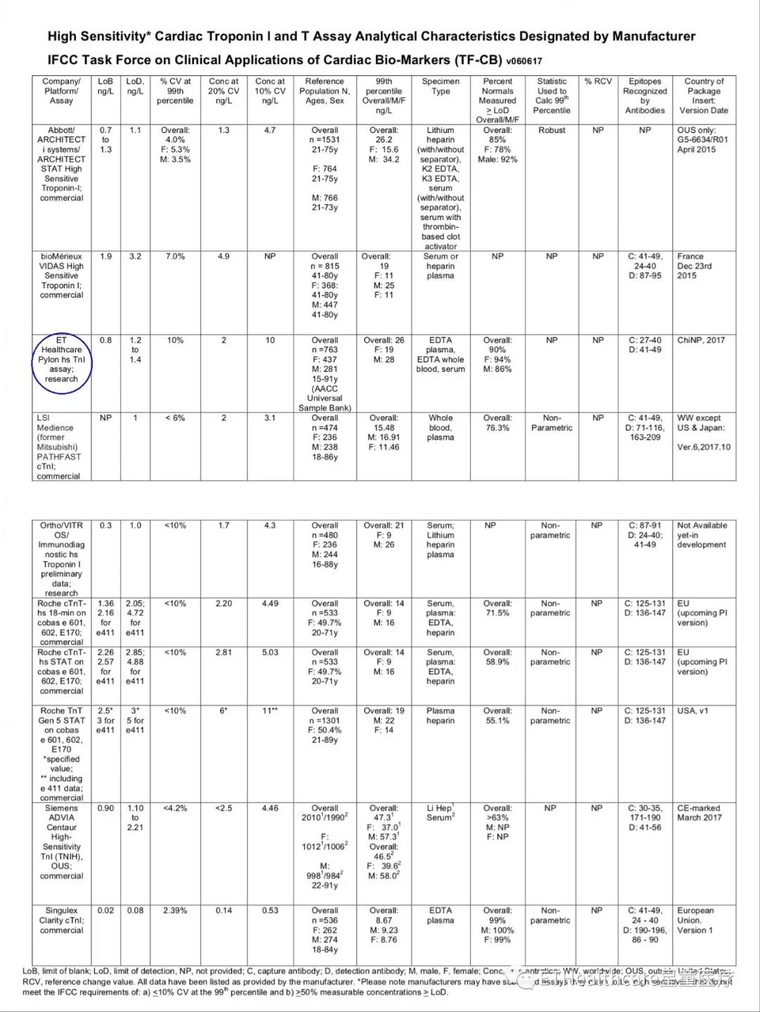 2017年6月,國(guó)際檢驗(yàn)協(xié)會(huì)IFCC的心臟標(biāo)志物工作組發(fā)布了最新的高敏肌鈣蛋白“瑯琊榜”。目前國(guó)際上共有八強(qiáng)。哪八強(qiáng)?羅氏、雅培、西門子、梅里埃、三菱、OCD、Singulex、星童。