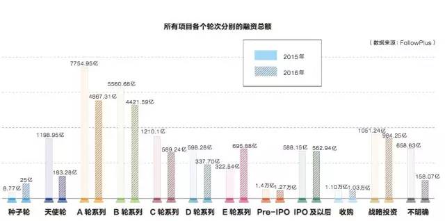 FollowPlus提供的數據顯示,據不完全統(tǒng)計,2015年獲得第一次投資的項目數量為2833個,2016年為861個。那些尚未產生正向現金流的公司不得不面臨下一輪的融資難題。兩年中,所有公司所有輪次獲得的融資金額總額分別為2.11萬億和1.72萬億。