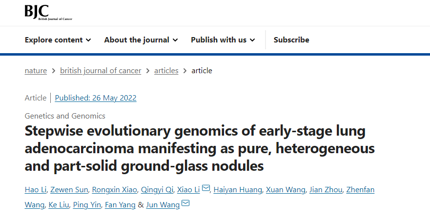 近日,王俊院士團(tuán)隊(duì)與啟明創(chuàng)投投資企業(yè)和瑞基因在亞實(shí)性結(jié)節(jié)型早期肺腺癌的基因組學(xué)研究的合作成果在國際期刊Lung Cancer和British Journal of Cancer發(fā)表。