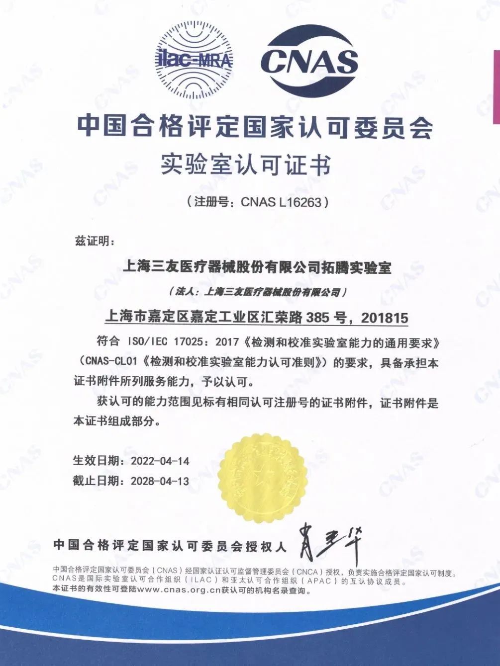 三友醫(yī)療拓騰實(shí)驗(yàn)室獲得CNAS認(rèn)可