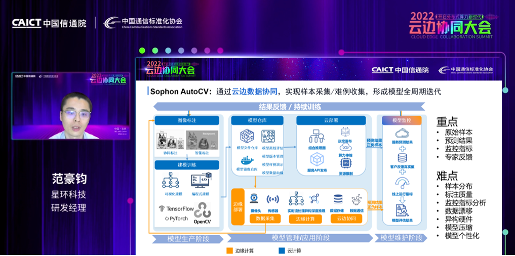 近日,中國信息通信研究院聯(lián)合中國通信標(biāo)準(zhǔn)化協(xié)會在線上召開了“2022云邊協(xié)同大會”。啟明創(chuàng)投投資企業(yè)星環(huán)科技受邀出席智能無限分論壇,研發(fā)經(jīng)理范豪鈞基于云邊協(xié)同的CV模型落地實(shí)踐進(jìn)行了星環(huán)科技Sophon AutoCV邊緣計算架構(gòu)分享。