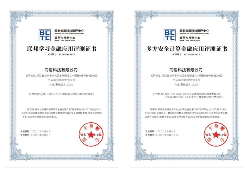 通過此次測評,同盾科技成為國內少數獲得BCTC多方安全計算+聯邦學習金融應用雙認證的企業(yè)之一。兩項測評嚴格依據中國人民銀行發(fā)布的《多方安全計算金融應用技術規(guī)范》行業(yè)標準、中國支付清算協(xié)會發(fā)布的《多方安全計算金融應用評估規(guī)范》團體標準、國家金融科技測評中心發(fā)布的《聯邦學習金融應用技術要求》企業(yè)標準。