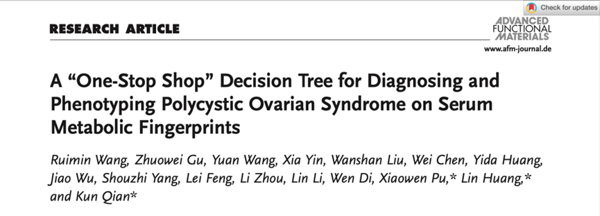 近日,上海交通大學錢昆教授研究團隊聯(lián)合啟明創(chuàng)投投資企業(yè)豪思生物在JCR Q1區(qū)國際材料領(lǐng)域頂級期刊Advanced Functional Materials上發(fā)表題為“A ‘one-stop shop’ decision tree for diagnosing and phenotyping polycystic ovarian syndrome on serum metabolic fingerprints”的研究論文。論文介紹了一種基于血清代謝指紋圖譜(Serum metabolic fingerprints, SMF)的“一站式”決策樹系統(tǒng)。