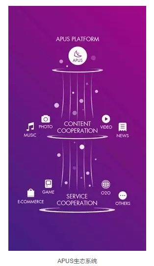 2014年7月APUS用戶系統(tǒng)正式上線。早期的APUS是一個流量入口平臺,現(xiàn)在APUS正在構(gòu)建的是一個生態(tài)系統(tǒng),或者說是開放平臺。