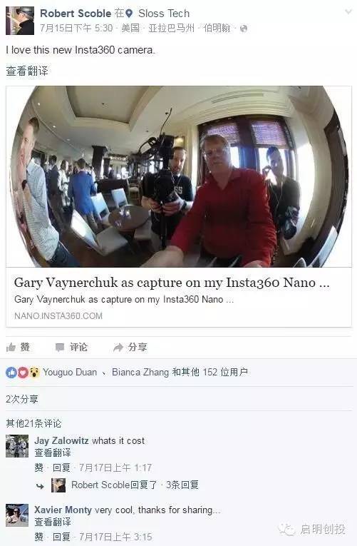 美國(guó)硅谷資深博主,UploadVR媒體科技編輯Robert Scoble在Facebook上對(duì)Nano的迷你輕便予以了充分肯定,在Facebook上分享的一張全景圖片獲得了大量點(diǎn)贊。