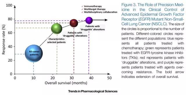 從最初的不篩選患者使用化療方案治療,到根據(jù)臨床特征選擇患者進行靶向治療,再到根據(jù)“可治療”基因狀態(tài)篩選患者有針對性選擇靶向甚至是多方案聯(lián)合治療,雖然縮小了治療適應(yīng)人群,但是針對特定人群不管是藥物反應(yīng)率(Response Rate)還是總生存期(Overall Survival)都有顯著提高(圖3)