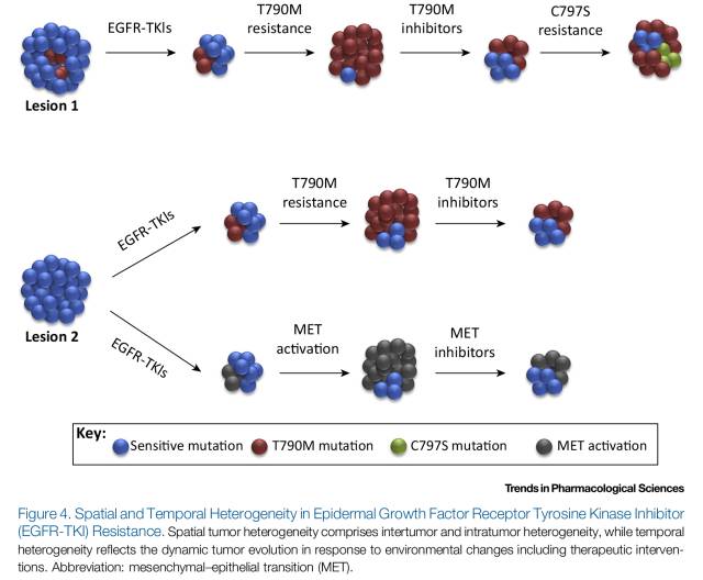 研究顯示,腫瘤的時間及空間異質(zhì)性在EGFR-TKIs耐藥機制中的作用極其重要。不同的耐藥機制可以表現(xiàn)為治療前已經(jīng)存在的突變克隆或者長期治療過程中逐漸凸顯的突變克隆,即時間異質(zhì)性;也可以表現(xiàn)在同一患者不同病灶中,即空間異質(zhì)性(圖4)。