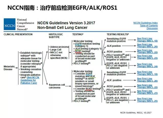 近期,美國癌癥聯(lián)盟(NCCN)發(fā)布了2017版NSCLC臨床實踐指南,新版NCCN指南在晚期NSCLC治療流程及一線治療進展后的處理上都體現(xiàn)出靶向診療在NSCLC上的新進展。