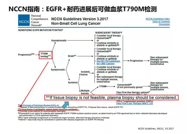 一代EGFR-TKIs一線治療后繼發(fā)耐藥機制中,T790M突變約占50%,第三代EGFR-TKIs問世標(biāo)志著EGFR T790M突變的NSCLC繼發(fā)耐藥患者的后續(xù)治療有了突破性進展。2015年11月FDA加速批準(zhǔn)了Osimertinib(AZD9291)用于治療EGFR T790M突變的、在EGFR TKI治療時或治療后進展的轉(zhuǎn)移性NSCLC。因此,2017版NCCN指南推薦EGFR-TKIs一線治療進展后應(yīng)檢測T790M突變,且當(dāng)組織活檢標(biāo)本不可獲取時可考慮選用血漿標(biāo)本進行檢測(圖7)。