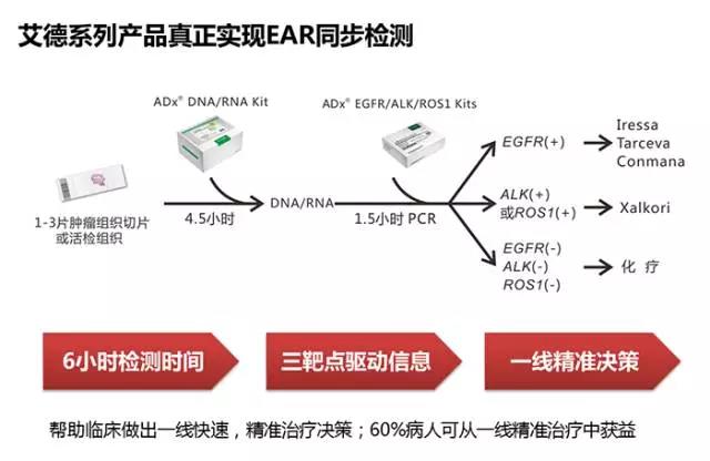 今年1月,艾德生物自主研發(fā)的EGFR/ALK/ROS1基因突變聯(lián)合檢測試劑盒獲得CFDA《醫(yī)療器械注冊證》,是國內(nèi)唯一獲批可同時檢測EGFR、ALK、ROS1三基因的試劑產(chǎn)品?;趶V泛應(yīng)用的PCR平臺及升級的檢測技術(shù),該試劑盒操作更加簡便、快捷,且適用新鮮組織及活檢、細(xì)胞學(xué)等小標(biāo)本。配套艾德生物DNA/RNA共提取試劑產(chǎn)品,當(dāng)天即可完成從核酸提取、上機檢測到出具報告的全部流程,大大縮短臨床診療等待時間,為NSCLC臨床診療真正實現(xiàn)EGFR/ALK/ROS1三基因同步檢測。