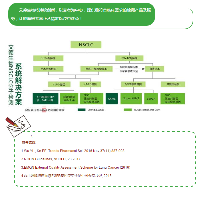 基于ADx-ARMS?技術(shù),艾德生物研發(fā)的EGFR基因突變檢測試劑盒是目前國內(nèi)唯一一個獲CFDA批準(zhǔn)可用于臨床血液EGFR檢測的ARMS法檢測試劑盒。配套艾德專用常溫采血管及循環(huán)DNA提取試劑盒(4mL血漿上樣),完全符合專家共識建議,為臨床提供血液EGFR檢測標(biāo)準(zhǔn)化解決方案。