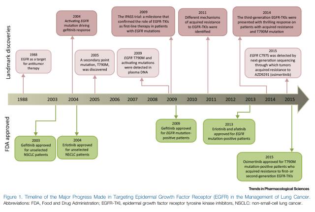 2003年,首個EGFR酪氨酸激酶抑制劑(EGFR-TKI)——吉非替尼獲美國食品藥品監(jiān)督管理局(FDA)批準(zhǔn),隨后卻因后續(xù)數(shù)據(jù)顯示無法延長患者生存而撤回;2009年,IPASS研究首次揭示了EGFR-TKIs作為一線治療與EGFR基因突變患者的相關(guān)性,隨后的研究也僅針對EGFR突變并證實在這類晚期NSCLC患者中,EGFR-TKIs療效優(yōu)于一線化療(圖1)?;谶@些結(jié)果,吉非替尼、厄洛替尼也獲批用于EGFR突變NSCLC的一線治療。如今EGFR突變檢測已成為全球大多數(shù)腫瘤中心的臨床常規(guī)檢測。此后針對一代EGFR-TKIs治療后耐藥的二代、三代EGFR-TKIs也被設(shè)計以針對繼發(fā)耐藥的分子機制為主,以EGFR T790M突變最為常見,并在不同的突變位點人群中表現(xiàn)出不同的治療活性(圖2)。