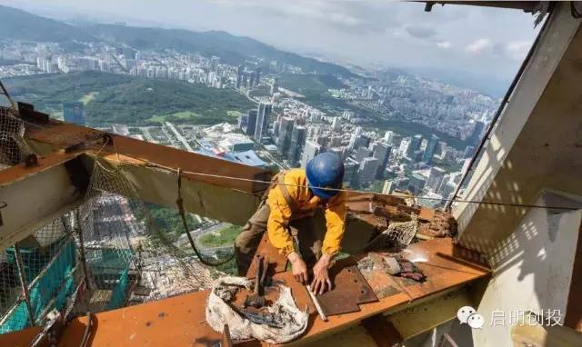 A worker braves scorching heat as he welds parts on top of the Ping An International Finance Center, Shenzhen,