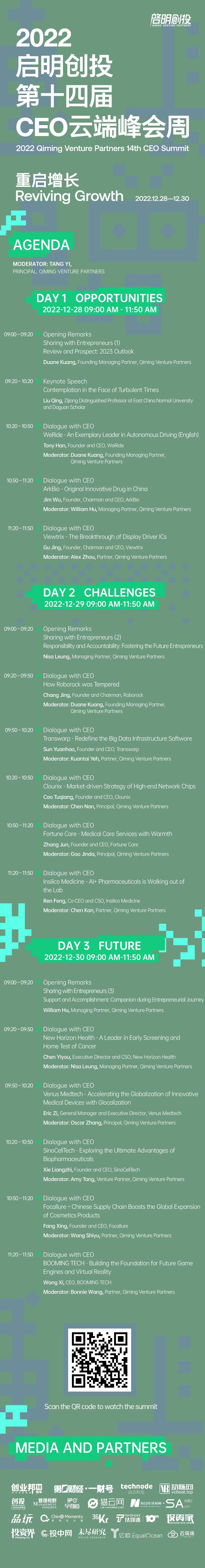 One guest speaker of honor, 13 members from Qiming's investment team, and 13 entrepreneurs from Qiming's portfolio companies will join the discussion and exchange ideas.